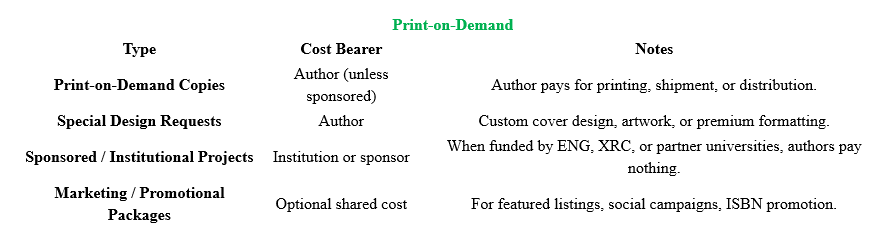 - Print-on-Demand Only: Physical copies are printed only on demand. Printing, shipping, and handling costs are borne by the author unless the project is sponsored by Publibre, ENG, Xpertno Research Center (XRC), or another supporting institution.